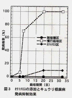 - 銀酸化物を被覆した布(オクトクロス@ )を用いて防除試験を試みたところ、1t規模の水耕装置で培養液中の銀濃度が40ppb(布面積 3cm2 /リットル)でキュウリ根腐病の発病をほぼ抑制し(図3)、キュウリに対する障害は認められない。