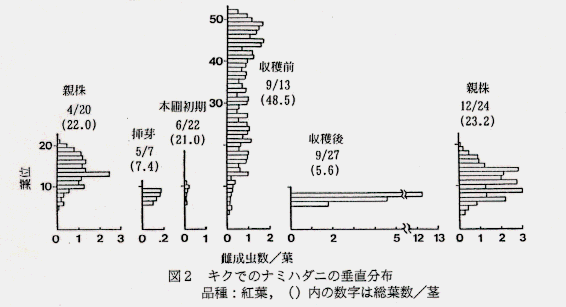 - キクのナミハダニ黄緑型は挿し芽などの人為的管理作業により、寄主を介して圃場を移動し、周年発生する。また、キクにおける寄生部位は生長に伴い上位葉へ移行する。摘心により分枝したいずれの枝上でも同じ発生消長がみられる。