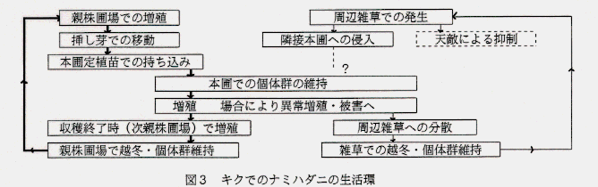 - 収穫後のキクで越冬したナミハダニは次年度の発生源となり、キク上での生活環を形成している。また、本圃で異常増殖した場合には、周辺の雑草へ分散し、越冬する。しかし、これらの次年度のキクへ再侵入は確認できていない(図3)。