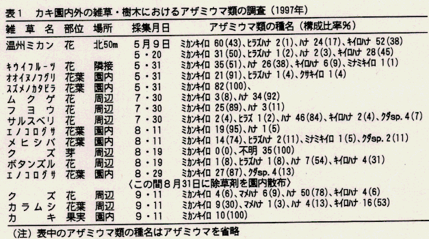 - 本種は5~6月に園周辺のカンキツ類及びキウイフルーツの花、園内雑草の優占種であるオオイヌノフグリ、スズメノカタビラに多数寄生し、7~8月には園内雑草の優占種であるエノコログサ、メヒシバに多く寄生し、園周辺のフヨウ、ムクゲの花にも見られる。除草剤散布後(8月31日)は園内雑草での寄生はなく、園周辺のクズ、カラムシの花で見出されるが、個体数は少ない(表1)。