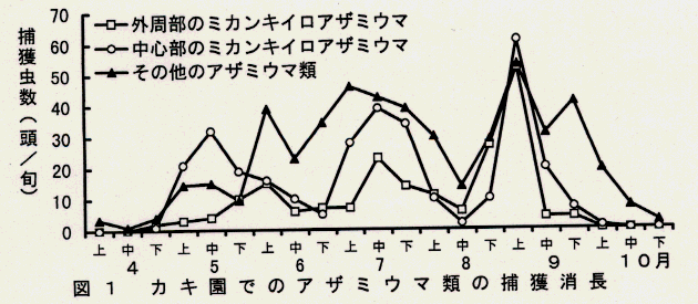 - 成虫のカキ果実への寄生は着色の始まった9月上旬からみられ、主に雑草で増殖した個体からの移行により加害されると推定される。無防除園の果実寄生のピークは9月下旬で10月には収穫終了で終息する(図2)。
