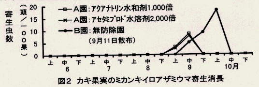 - 9月中旬にはアセタアミプリド水溶剤2000倍及びアクリナトリン水和剤1000倍を散布すると、その後の果実寄生は認められず、薬害の発生もないことから、両剤は防除薬剤として実用性がある(図2)。