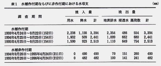 - 調査地域は琵琶湖東部の平坦地にあり、土壌は中粗粒灰色低地土で調査対象水田面積は 3.9haである。水の流入・流出は作付期2400~3400mm、非作付期480~490mmであった(表1)。