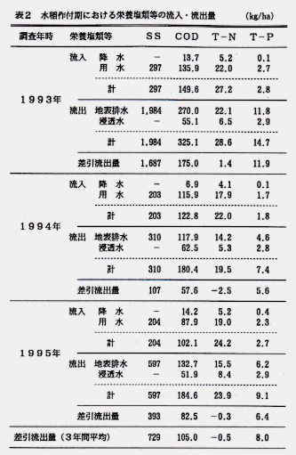 - 水稲作付期のリン流出量は、3年間の平均で +8.0kg/haと前回調査値( +0.4Kg/ha)より多くなった。これは、1993年の多量降雨時の流出量が極めて多くなったことが一因であると考えられる(表2、参考)。