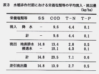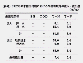 -0.5kg/ha、リンで+8.0kg/ha、水稲非作付期では各々+2.7kg/ha、+0.5kg/haとなる。水稲作付期の窒素流出量は、10年前と比べ低下が認められる。