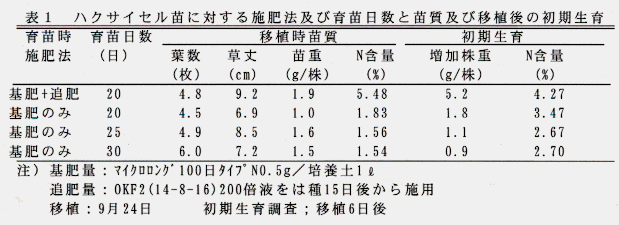 - 夏まきハクサイセル苗は徒長しやすいため施肥量を制限して苗の移植適期(18~20日)が過ぎても草丈等の機械適性を失わないようにしていた。この場合のセル苗は窒素含量が低く、初期生育が劣る。また、その傾向は育苗日数と共に強くなる(表1)。