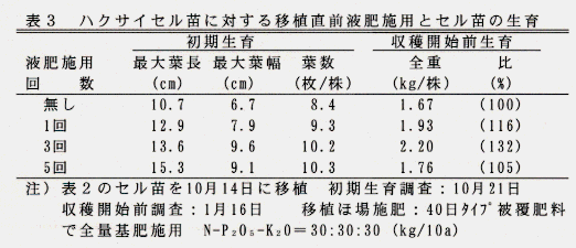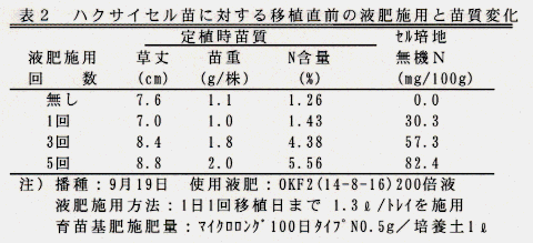 - 機械移植用夏まきハクサイセル苗は、コンパクトな草姿にするために施肥量を制限すると、窒素含量が低下し定植後の初期生育が劣る。このような苗は定植1~2日前に2~3回液肥施用すると、定植時の草姿は小さいまま初期生育が向上する。