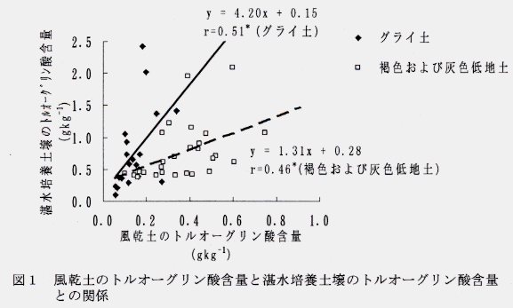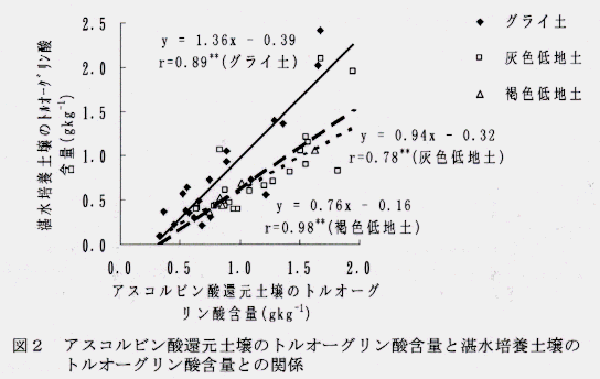 - アスコルビン酸で還元処理した土壌および湛水培養土壌のトルオーグリン酸含量の間には、正の相関関係が認められ、土壌タイプ別に両者の関係をみると、相関係数が向上する(図2)。
