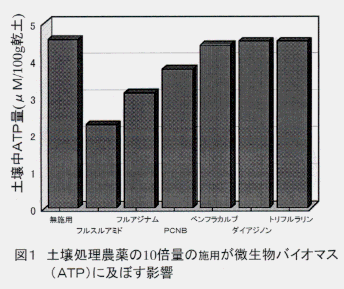- 細粒灰色低地土の転換畑におけるキャベツ栽培に使用される6種類の土壌処理農薬(殺菌剤3剤、殺虫剤2剤、除草剤1剤)が、微生物バイオマスに及ぼす影響を、室内試験でATP量を指標に調べると、殺菌剤類は標準量の10倍量の処理でフルスルアミド>フルアジナム>PCNBの順に土壌の微生物バイオマスを低下させる(図1)。
