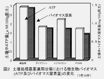 - 上記の薬剤の内、影響の少なかったダイアジノン(殺虫剤)、トリフルラリン(除草剤)及びPCNB(殺菌剤)を用いて農薬連用ほ場(キャベツ・年2作)を設け、5年間10作標準量を連用すると、収量性には影響が見られないものの、微生物バイオマスを示す、ATPやバイオマス窒素の低下がみられる。両者の低下傾向はやや異なり、微生物相へも影響していると推察される(図2)。