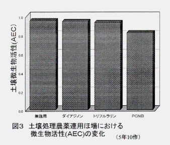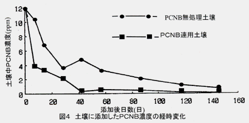 - PCNBの連用により、微生物全体の生化学的活性(AEC)は低下するが(図3)、土壌のPCNBの分解速度は無処理土壌よりも速くなる(図4)。一方、ダイアジノン、トリフルラリンの連用では影響は少ない。