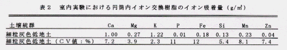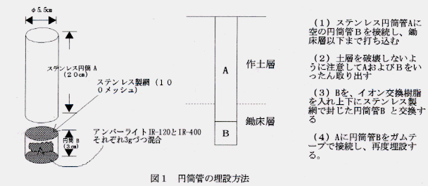 土壌統群が異なる3圃場(表1)で、湛水直播・乾田直播栽培を行い、イオン交換樹脂(強酸性陽イオン交換樹脂と強塩基性陰イオン交換樹脂の混合物)を下部に装着したステンレス製円筒管を播種時に条間または株間に埋設した(図1)。水稲収穫時あるいは入水時に掘り出し、イオン交換樹脂に吸着された各イオンを 1N-HCl 5ml に溶出させ、水で洗浄して 100ml に定容後、各成分を定量し、溶脱量を推定した。なお、円筒管の埋設は6連制とした。
