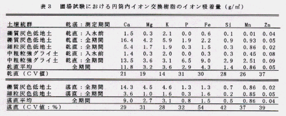 - 播種後1ヶ月間の乾田期間中の溶脱量は、カリウムを除くと各イオンともわずかで、溶脱はほとんどが入水後に起こる(表3)。