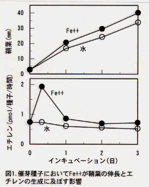 - 2価鉄は水稲種子の籾殻におけるエチレンの生成を促進する。2価鉄によるエチレンの生成は低酸素濃度下でも行われ、鞘葉の伸長を促進する。