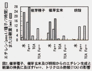 - 種子、籾殻、玄米にFe++ を投与すると、種子と籾殻においてエチレンの生成が増大した(図2)。Fe++ による鞘葉の伸長促進効果は、籾殻を持たない玄米では小さい。またトリクロル酢酸によって生理反応を停止させても、エチレンは生成されるので、生化学反応ではない。