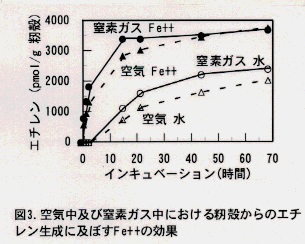 - 水田におけるFe++ 濃度は多くの場合1mM以下であるが、籾殻からのエチレン発生の促進は0.02mM以上のFe++ 濃度で認められ2~200mMで最大であった。Fe++ が投与された時、エチレンは最初の3時間までは直線的に生成され、その後平衡化した(図3)。また窒素ガス中でもエチレン生成の促進作用は認められるので、この反応は酸素を必要としない。