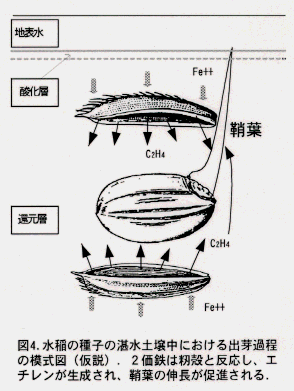 - これらの結果は、イネ種子が播種されたとき、湛水土壌中ではFe++ の存在ゆえに籾殻からのエチレン生成が促進され、そのエチレンが鞘葉の伸長を促進し、苗立ちを安定化することを示している(図4)。