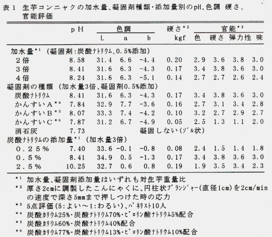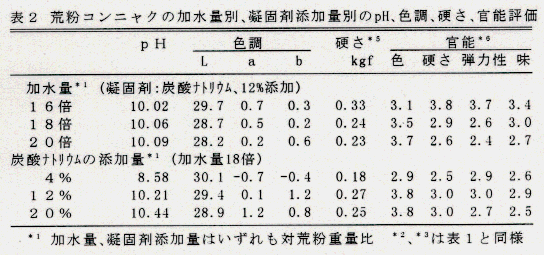- 生芋コンニャクを木灰のあく汁で固める製法は経験によるところが多く、製品の品質が一定しない要因となっている。また、荒粉(芋を短冊状に薄切りにして乾燥させたもの)を用いれば生芋コンニャクに近い製品の周年加工が可能となる。そこで、生芋および荒粉を原料としたコンニャク製造における加水量、凝固剤の種類、添加量を検討した。