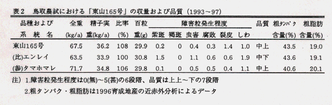 - 大豆系統「東山165号」は現奨励品種「エンレイ」と比較して、収量・品質とも安定して上回っており、タンパク含量も同等に高いことから、「エンレイ」の代替品種として準奨励品種に採用する。