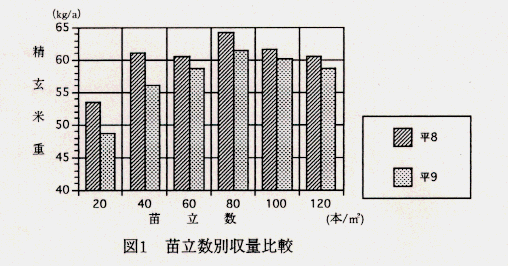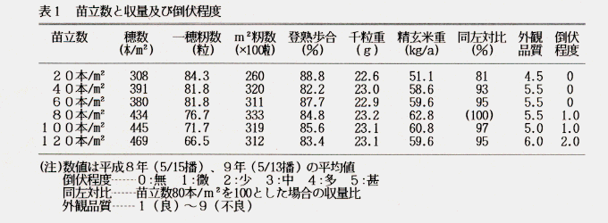 - 最も安定した収量が得られる苗立数は、80本/m2 であり、それ以下或はそれ以上で順次収量は低下する(表1、図1)。