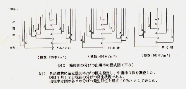- 「どんとこい」が40本/m2 程度の低苗立数でも比較的収量低下が少ない要因として、下位節からの分げつ及び2次・3次分げつの発生が多く、分げつ力が高く穂数が多いことによるものと考えられる(図2)。
