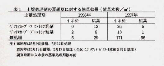 - 播種後の土壌処理剤散布は夏雑草の発生密度を低下させるのに有効である(表1)。ただし発生を皆無にするのは難しく、処理直後からヒエは発生を始める(図1)。