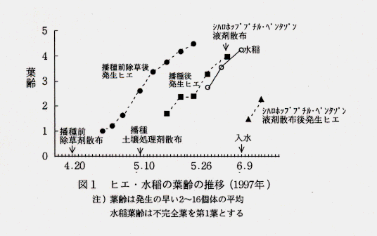 - 慣行の不耕起乾田直播栽培においては播種前からヒエが発生する場合が多く、その葉齢は入水のかなり前にシハロホップブチルを含む茎葉処理剤の適用晩限である4.5~5葉に達する(図1)。したがってヒエに対する茎葉処理剤の散布は2回必要となる。