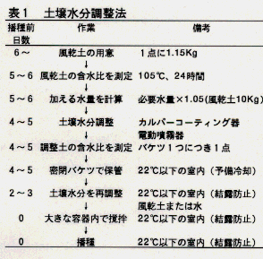 - 温度、土壌含水比、床土・覆土の厚さ、播種量を検討した結果、適当な検定条件は次の通りであった。灰色低地土を3mm目の篩にかけ風乾後、土壌水分を調整する(表1、水ポテンシャルで-1.0から-1.2MPa、含水比で0.080から0.095)。この土壌を蓋つきプラスティック容器(13.5×13.5×8.8cm)に深さ4cmまで充填する。そこに乾籾(49粒)を播種し鎮圧した後(26g/cm2 程度)、覆土(30mm)して、再び鎮圧する。検定は人工気象器(22℃)で行う。