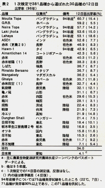 - この検定法を用いて、世界各地を収集元とする特性の異なる381品種を検定し、乾燥土壌中出芽性の優れた30品種を選定した(表2)。12日目の出芽率は、バングラデシュより収集したBoro品種群(乾期である11-1月に播種される。低温耐性に優れる。)のMoulla Topaが最も高い。