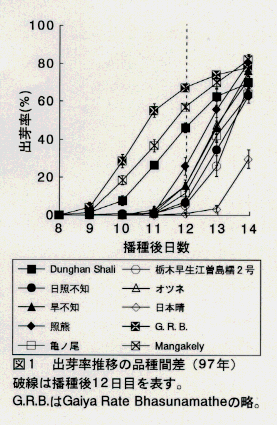 発表論文等 : イネ種子の乾燥土壌中出芽性のスクリーニング、日本作物学会紀事、66巻(別1号)、10-11、1997.
