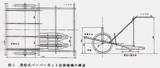 この移植機は市販の連結式ペーパーポット移植機「ひっぱり君」を参考に改良を加え、連結式ペーパーポットを展張しながら植付ける簡易な移植機である。