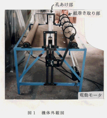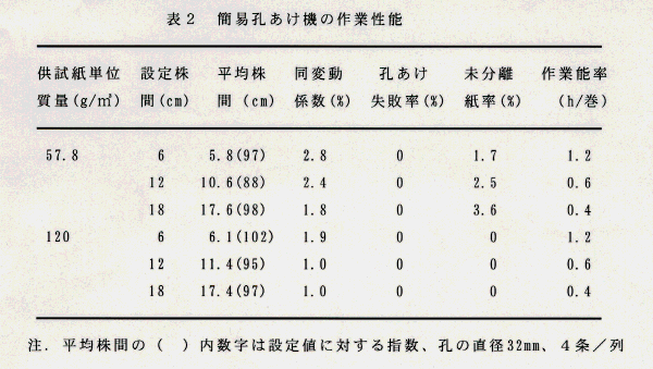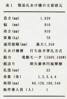 - 開発した孔あけ機は等辺山形鋼の枠組みに孔あけと紙送り機構を組み込んだもので、パンチャーの孔あけ機構を応用し、鉄板の孔と円筒刃により紙を切断して孔あけを行う。円筒刃はホルダに装着し、その配置によって条数や条間を設定できる。孔あけ部の上下作用と紙送りは減速機を内蔵した電動モータによって駆動される。孔あけと紙送りの同調をとるため、間欠伝達歯車(ゼネバ)を介し円筒刃が上がっている間に、4枚の円板による摩擦駆動で紙を巻き取る。株間の設定は紙送り機構の末端のチェン駆動の変速比を変えて行う(図1、表1)。