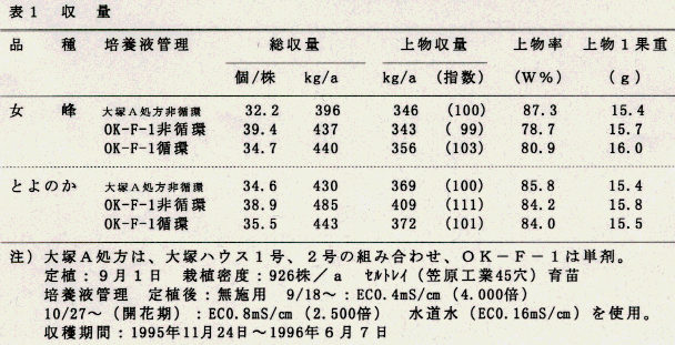 - 総収量は、両品種とも大塚A処方に比べ大塚OK-F-1でやや多い。上物収量は‘とよのか’で、大塚OK-F-1の非循環が409㎏/aとやや多い。‘女峰’では350㎏/a前後で培養液管理の違いによる収量差は認められない(表1)。