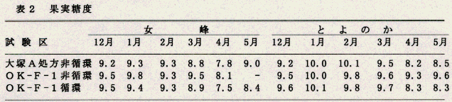 - 果実糖度は、両品種ともに12月から3月までは9~10%、4月から5月にかけては、やや低い傾向となる。‘とよのか’では、4月以降大塚OK-F-1の非循環施用でやや高い数値となるが、その他の区では培養液管理による差は認められない(表2)。