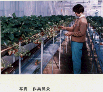 - 施設野菜栽培では、同一作物の連作による障害が問題となっており、その対策として除塩や土壌消毒などに多労を要している。また、イチゴ栽培では腰をかがめて行う作業が多く作業姿勢の改善が課題である。すでに、滋賀農試では、緩衝能力を持つ土壌ともみがらを培地とした少量土壌培地耕を開発し、キュウリ・トマトでは土耕栽培と同等以上の収量を得ている。そこで、栽培床を高床とした少量土壌培地耕によるイチゴ栽培で、作業姿勢の改善を図るとともに養液管理について検討する。