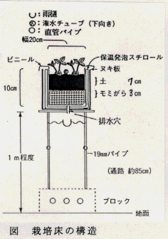 - 栽培装置は、床幅20㎝、高さ10㎝の木枠に、厚さ1㎝の発砲スチロールを両側面および底面 に敷き、厚さ1㎜の透明ビニルフイルムをかけ、下層3㎝にもみがら、その上層に土壌を詰めて1m程度栽培床を高くする(図、写真)。高床式とすることで定植および防除、収穫等の作業姿勢の改善が図られる。