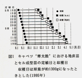 - キャベツのセル成型苗は地床苗より3~4日早く定植すれば地床苗と同時に収穫できる。加西市周辺平地部での寒玉系晩生‘寒太鼓’の限界定植日の目安は9月8日で、年平均気温が1℃異なると7~12日、品種間では4~8日のずれが見込まれる。