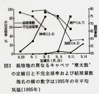 - 異なる地域でのキャベツ‘寒太鼓’の良品生産のための限界定植日を不完全結球が10%を超えるかあるいは、結球葉数が60枚以下になる時期から推定すると、年平均気温13.4℃の神崎町では8月29日、14.2℃の加西市や14.7℃の神戸市西区では9月8日が限界定植日となり、年平均気温1℃の差で7~12日のずれがある(図2、3)。