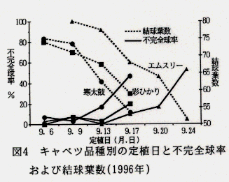 - 同様の方法により、品種特性の違いによる限界定植日は寒玉系晩生‘寒太鼓’に比べ、寒玉系中晩生で低温伸長性に優れた‘彩ひかり’は約4日、寒玉~春中間系中晩生で低温結球性の高い‘エムスリー’は約8日遅れてもよいと考えられる(図4)。