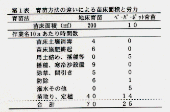 - ペーパーポット(220穴)による育苗、定植後の生育については問題点もなく、育苗・定植作業が省力化できた(第1表)。高温時のペーパーポット育苗では根がらみが生じ易いが、育苗箱の下敷きに根圏制限シート(スピンアウト)を用いることにより、定植もスムーズに行えた。