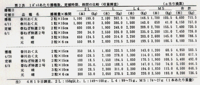 - 1ポット当たりの播種量、定植時期、株間について検討した。収穫時の調査では、定植時期を比較すると6月1日定植区の方が多収であった。また、6月1日定植の場合ペーパーポットの1ポット当たり播種粒数は春川おく太、特選春ネギ2号は1粒播き、元晴晩生では3粒播き、株間はそれぞれ10cmが多収であり、春ネギにおいてもペーパーポット育苗により、省力化的な栽培が可能であった。(第2表)