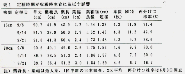 - 9月下旬に定植すると、9月上中旬に定植するより分けつ数が2~3本減少し、再分けつ株率も大幅に低下する(表1)。
