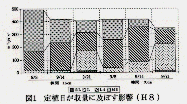 - 規格別収量では9月下旬の定植は、9月上旬定植より総収量がやや減少するが、商品価値の高いL、2L規格以上の収量が20~40%向上する(図1、2)。これに伴い、出荷調整作業の軽減もはかれる。