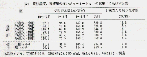 - 収量は、標肥、少肥に関わらず多灌水で多くなる。施肥量の違いによる収量の差は認められない。また、養液土耕での収量はいずれの施肥灌水においても慣行栽培を上回る。切り花品質は養液土耕と慣行栽培で大きな差は認められない(表1)。