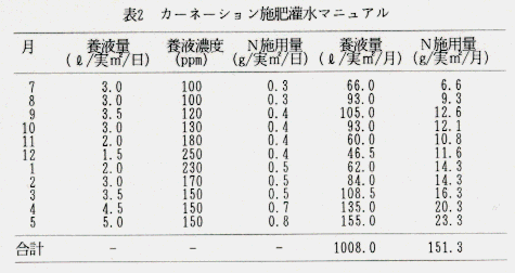 - 以上の結果に基き、養液土耕のカーネーション用施肥灌水マニュアルを作成する(表2)。また、これにより養液土耕の総窒素施肥量は慣行施肥基準に比べ15%の減肥となる。