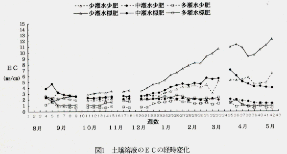 - 土壌溶液のEC値は多灌水・標肥、中灌水・少肥、多灌水・少肥とも1.0~2.5ms/cmの間で推移する(図1)。土壌のpF値は多灌水と中灌水では栽培期間を通じ1.3~1.4で推移するが、少灌水では4月以降急激に上昇し、5月はかなりの乾燥が認められる。