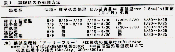 - 処理方法は、表1に示すとおり、は種後20℃で24時間催芽を行い、2℃暗黒で30日間の「種子低温処理」を行う。その後20日間クーラー育苗(max25℃、min15℃)を行い、セルトレーの状態で2℃、16時間照明(蛍光灯で300~800 lux)下で30日間の「苗低温処理」を行う。