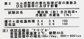 - セル成型苗での低温処理後の葉数増加は、ほとんど認められず生存株率も100%である(表2)。