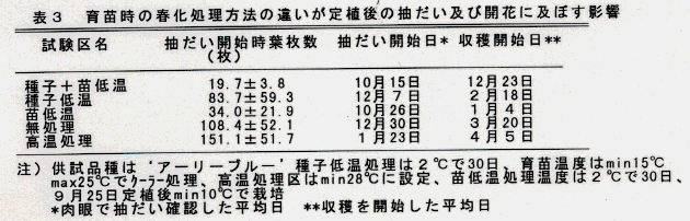 - 抽だい開始日及び収穫開始日は、「種子+苗低温処理」で早くなる(表3)。