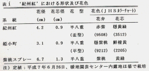 - 寒小ギクとスプレーギクを交配後選抜を行い、新品種‘紀州紅’を育成した。本品種は、赤紫、盃型、半八重咲きの寒小ギク早生品種で、6月下旬に定植すると12月上中旬に開花が認められる。